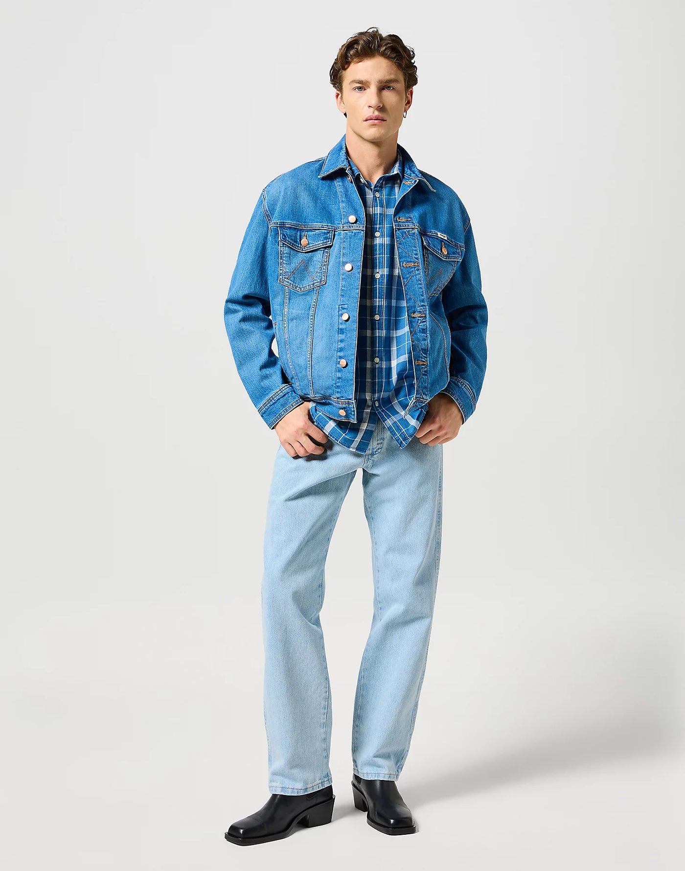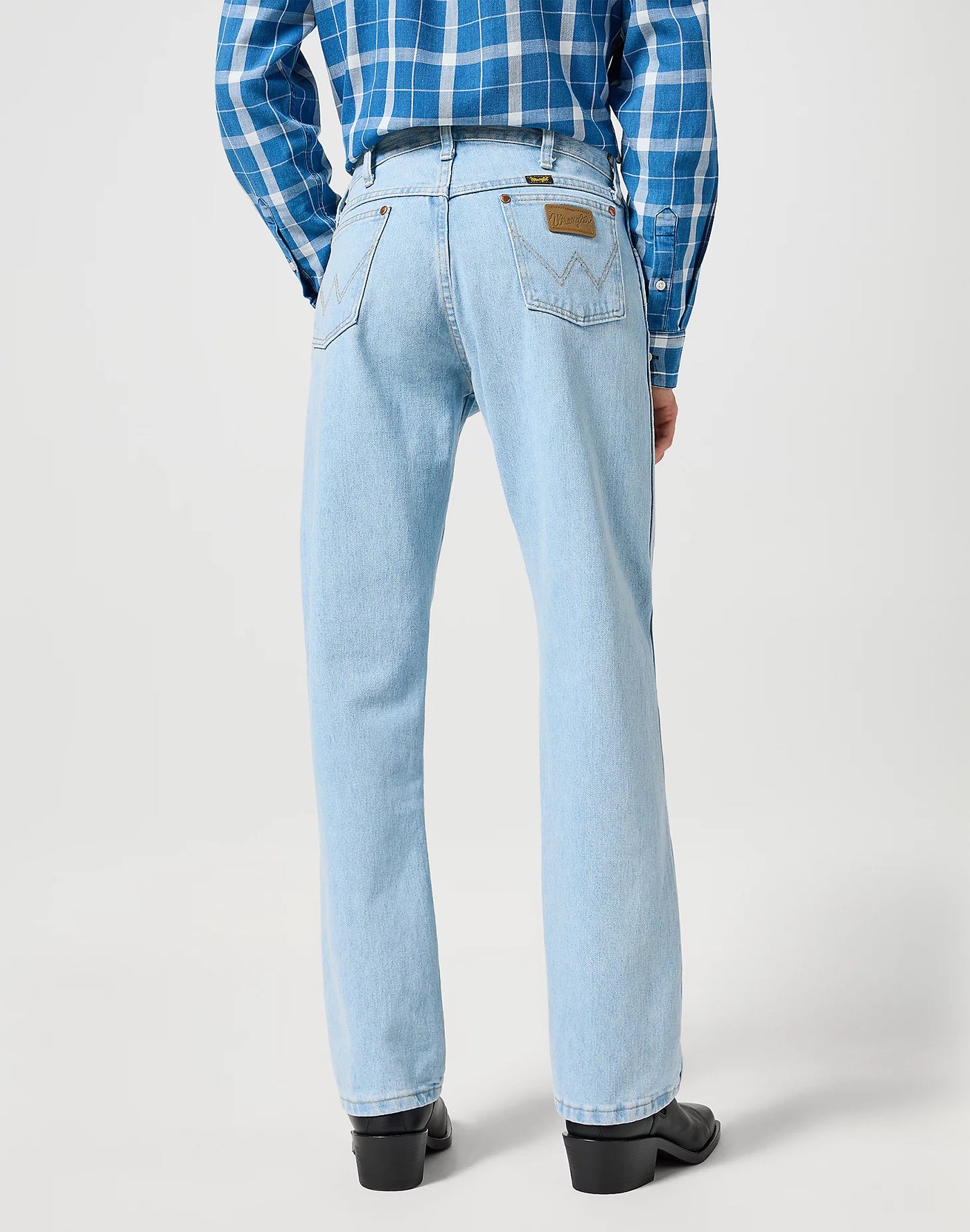 Zu den Merkmalen gehören 7 Gürtelschlaufen, ein Reißverschlussschlitz mit Knopf, durchgehende Außennähte, flache Nieten, die kultigen 'W'-Nähte und das typische Wrangler-Branding.