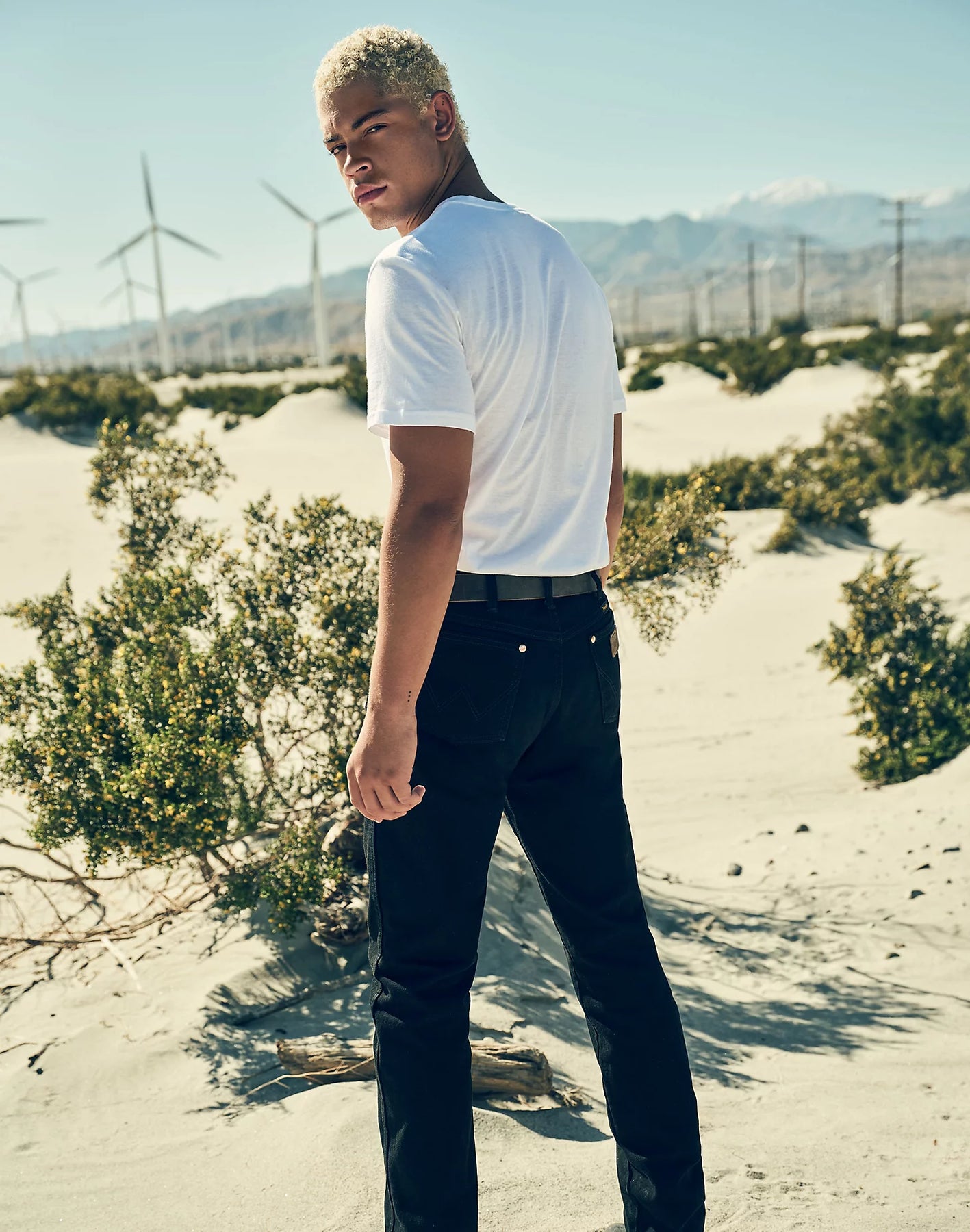 Zu den Merkmalen gehören 7 Gürtelschlaufen, ein Reißverschlussschlitz mit Knopf, durchgehende Außennähte, flache Nieten, die kultigen 'W'-Nähte und das typische Wrangler-Branding.